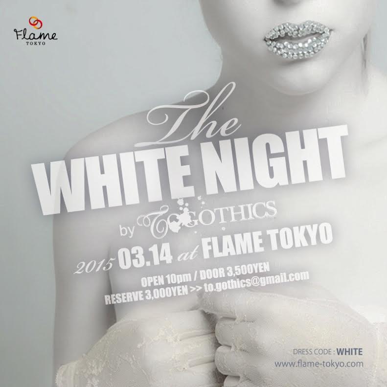 お名前(カタカナフルネーム)、メールアドレスを明記の上、件名【3/14(土)WHITE NIGHT予約】にてto.gothics@gmail.com宛にメール送信してください。返信メールが届いて予約成立です。ご予約名は当日ご持参いただく身分証と同一にしてください。携帯電話の受信設定をご確認ください。1週間経過しても返信メールのない場合はお手数ですが再送してください。